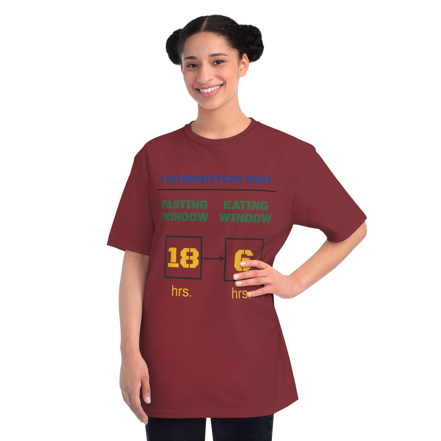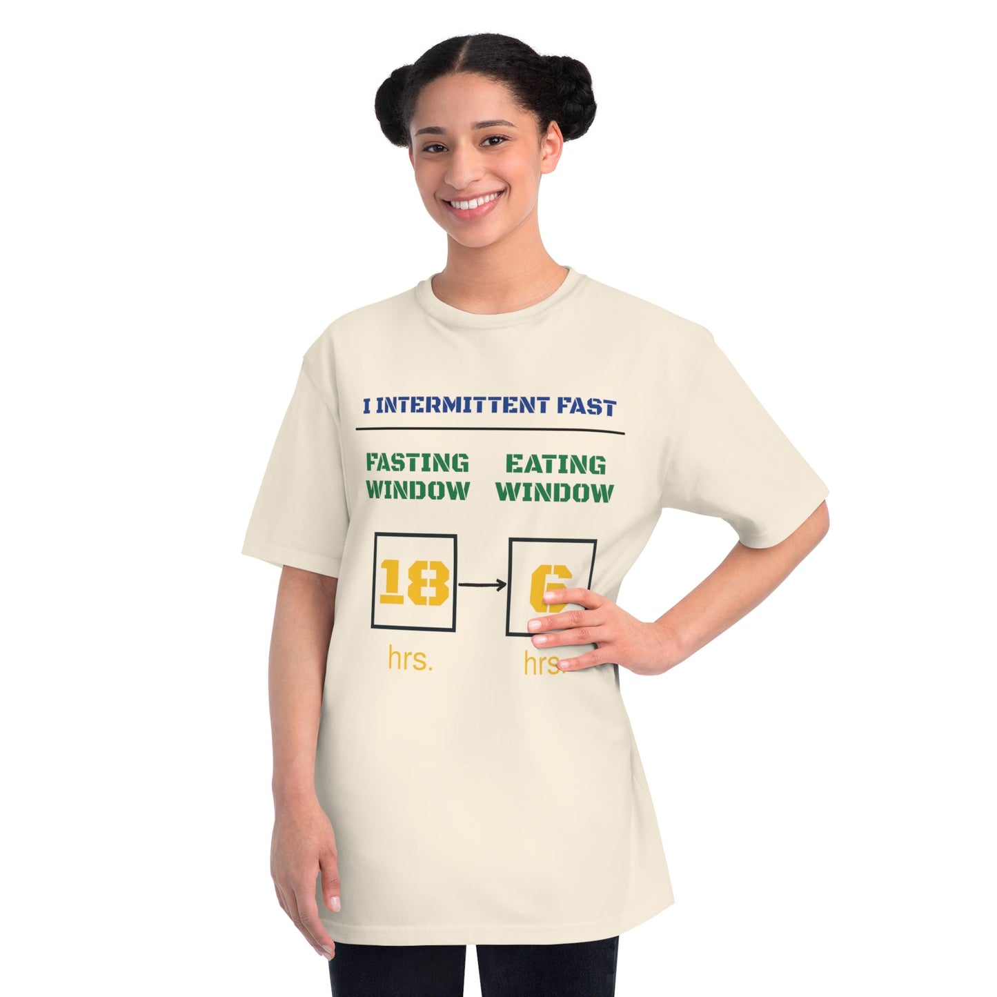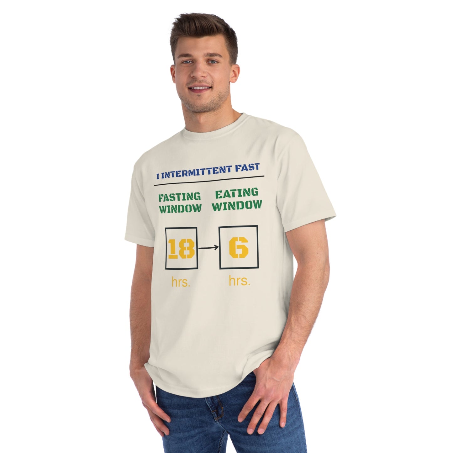 This T-Shirt is made from 100% certified organic cotton, providing a warm and flexible fit perfect for daily wear. Perfect for those following a 18-6 intermittent fasting schedule. This T-Shirt is relevant to health enthusiasts, intermittent fasters and those looking for organic clothing options. Perfect for wearing during health and wellness events, gym workouts, or casual outings.