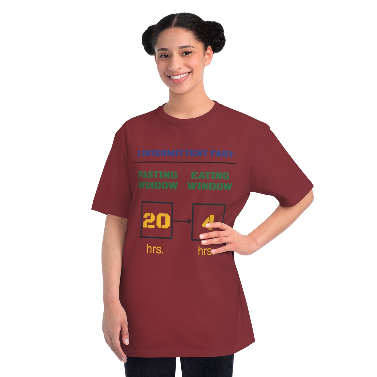 This T-Shirt is made from 100% certified organic cotton, providing a warm and flexible fit perfect for daily wear. Perfect for those following a 20-4 intermittent fasting schedule. This T-Shirt is relevant to health enthusiasts, intermittent fasters and those looking for organic clothing options. Perfect for wearing during health and wellness events, gym workouts, or casual outings.
